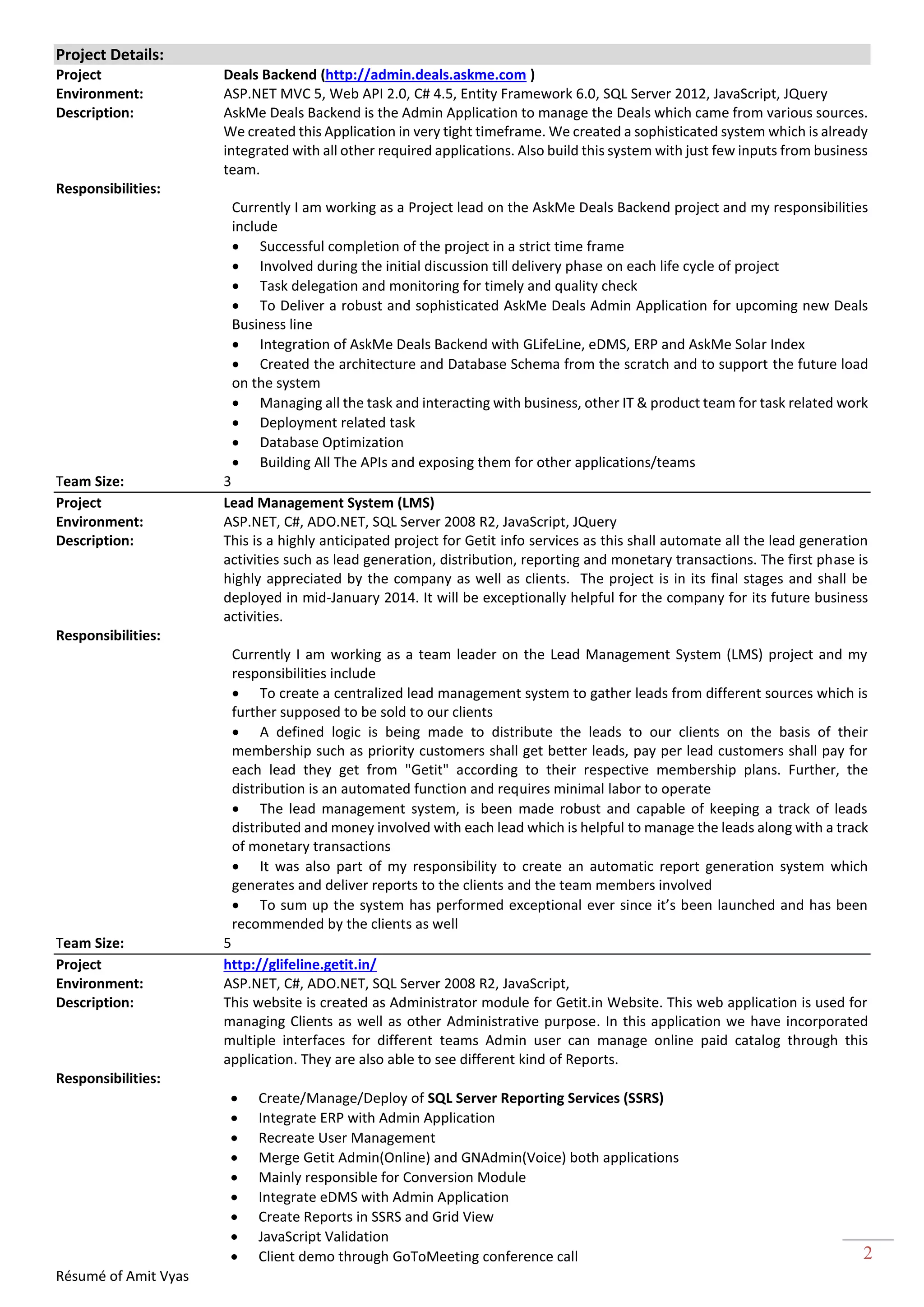Amit Vyas is a .NET developer with over 8 years of experience managing projects involving design, development, implementation, reporting, testing and debugging of web and Windows applications using technologies like ASP.NET, C#, SQL Server. He has experience in the full software development lifecycle from requirements gathering to deployment and project management. Currently he works as a technical lead for a company developing applications like a deals backend system and lead management system.