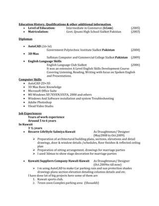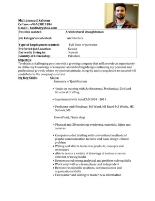 Muhammad Saleem is an experienced architectural draughtsman currently living in Kuwait, seeking a full-time or part-time position. He possesses a strong background in AutoCAD and 3D modeling, along with skills in various computer applications and drafting techniques. His work experience includes significant projects in Kuwait, such as designing parking areas and architectural plans, and he is fluent in Urdu, Arabic, and English.