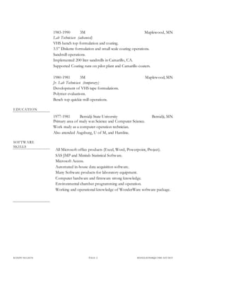 Randy Nelson has over 34 years of experience in engineering roles focused on product development, testing, and manufacturing. He has worked in coating operations and quality control for companies like 3M and Aerotek. His background includes experience with formulation development, coating processes, statistical analysis, testing, and lean manufacturing practices. He is currently seeking a new engineering position in manufacturing or R&D.