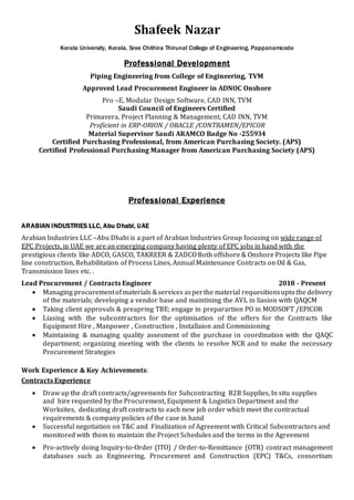 Shafeek Nazar is a senior materials, procurement, and contracts professional with over 10 years of experience in managing procurement, sourcing operations, and vendor development, leading to efficiency improvements and cost savings. He has significant expertise in developing procurement strategies, managing supplier relationships, and ensuring compliance with engineering standards across various EPC projects. His educational background includes a B.Tech in Mechanical Production Engineering, and he is certified in several procurement and engineering management fields.