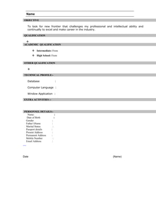 This document is a resume for Name. It lists an objective to find a new challenging career opportunity to excel professionally. It includes academic qualifications of intermediate and high school degrees from unspecified schools. Technical skills listed are databases, computer languages, and Windows applications. Personal details provided are name, date of birth, gender, father's name, marital status, contact information, and passport details.