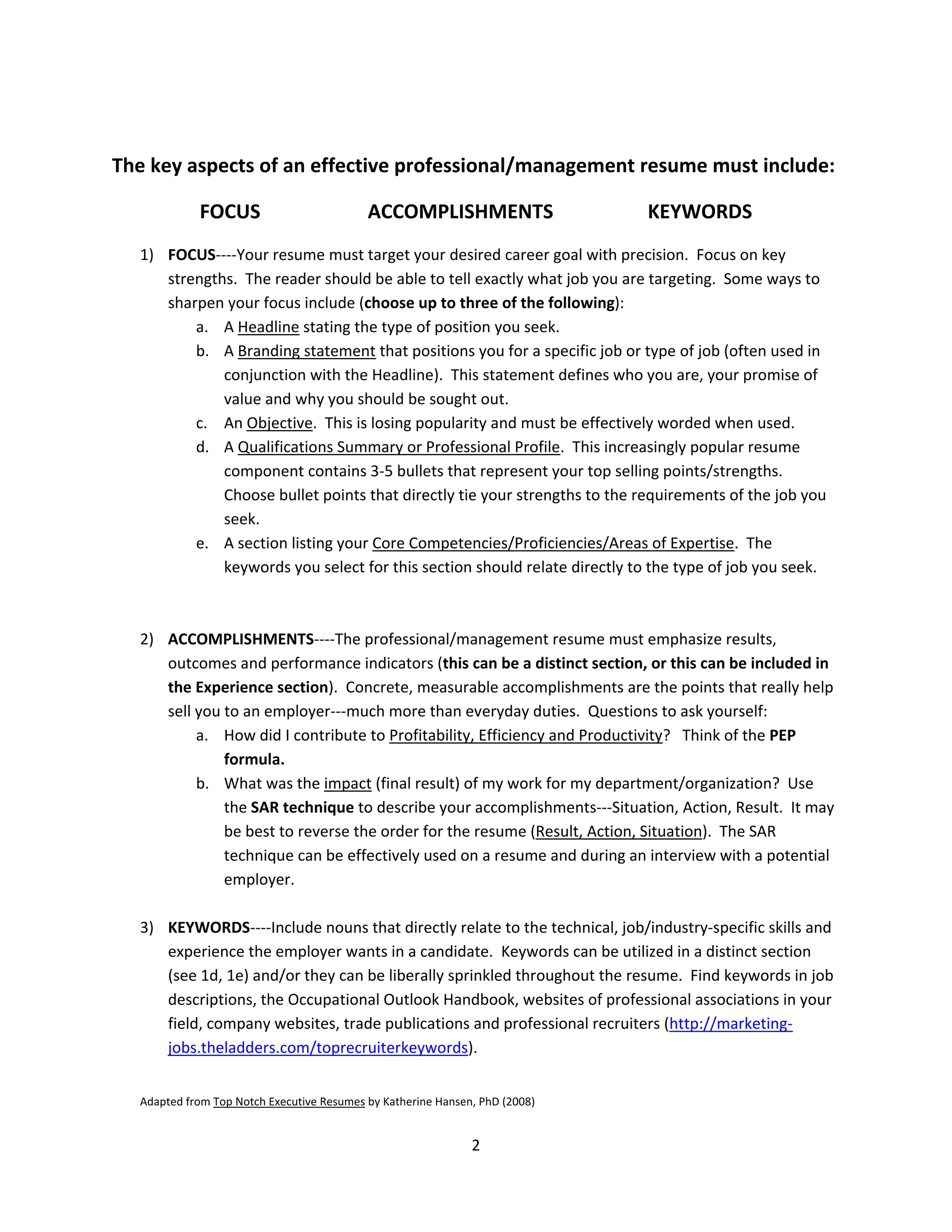 This document provides guidance on key aspects of an effective professional resume, including focus, accomplishments, and keywords. It emphasizes targeting the resume to a specific career goal, highlighting measurable accomplishments over duties, and including industry-relevant keywords. Examples are given for focus areas like headlines and qualifications summaries, as well as for describing accomplishments using results-oriented language. The document aims to help job seekers strengthen their resumes.