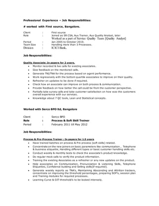 Indumathi.J has over 12 years of experience in operations, training, quality management, and transitioning business across multiple industries including retail, banking, and BFSI. She is proficient in managing teams to drive metrics and implement procedures and service standards for business excellence. Her skills include strong communication, presentation, and ability to manage multiple tasks and people. She held roles such as quality analyst, process and soft skills trainer, and deputy manager where she was responsible for operations, training, and quality functions for contact centers with over 150 seats.
