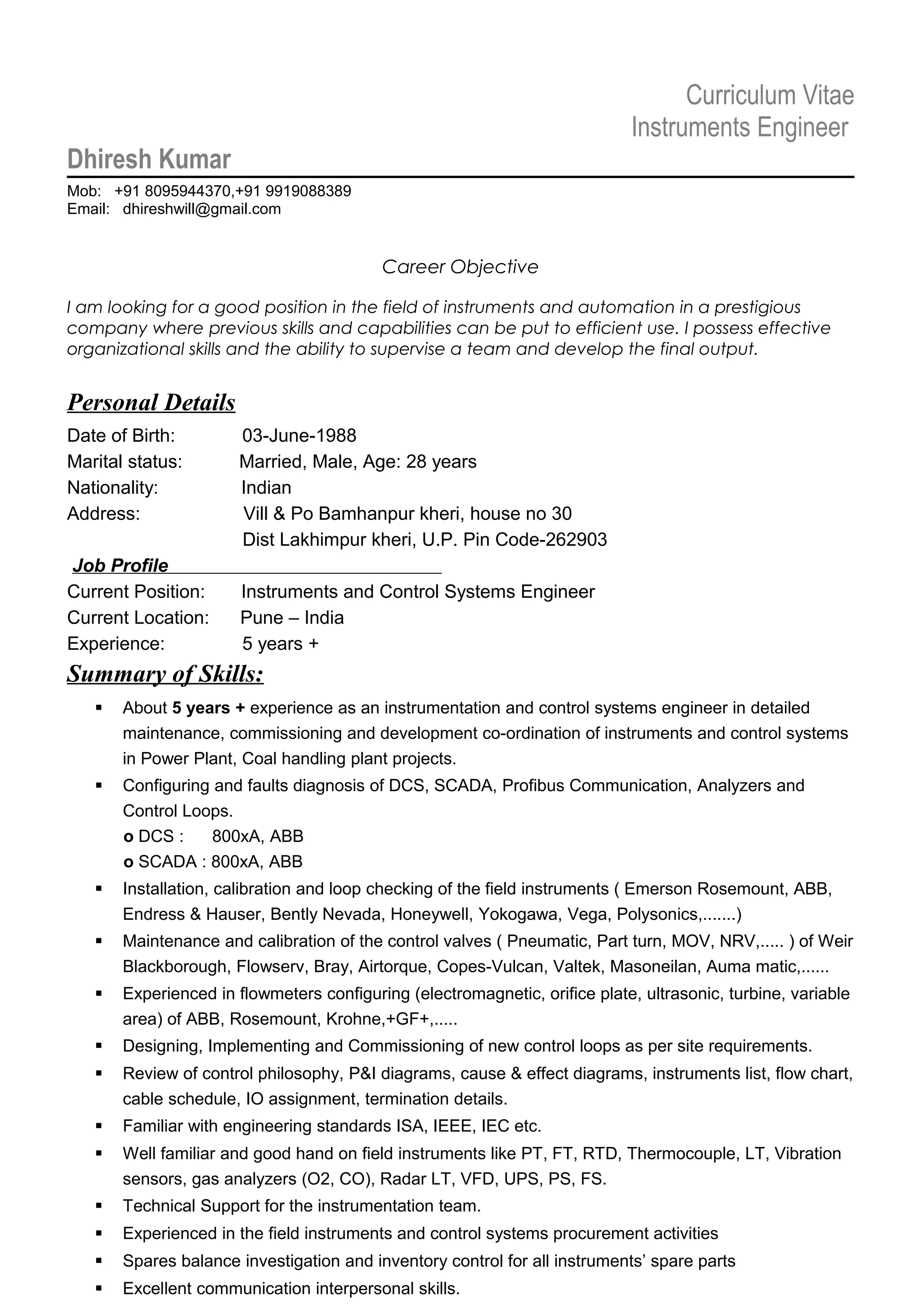 Dhiresh Kumar is an instrumentation and control systems engineer with over 5 years of experience in the power and coal handling plant industries, currently employed at Thyssenkrupp Industries in Pune, India. He specializes in the maintenance, commissioning, and development coordination of instrumentation and control systems, with proficiency in various DCS and SCADA systems and a broad range of field instruments. Dhiresh holds a Bachelor of Technology in Electronics and Communications Engineering and demonstrates strong technical skills alongside effective organizational abilities.