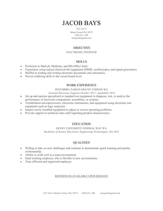 Jacob Bays is seeking an electronic engineer position and has a Bachelor's degree in Electronics Engineering Technologies from DeVry University. He has over a year of experience as an assistant electronic engineer where he tested equipment using tools like logic analyzers and troubleshot issues. Jacob is proficient in programming languages and lab equipment, and is known for being a hard worker willing to take on new challenges.