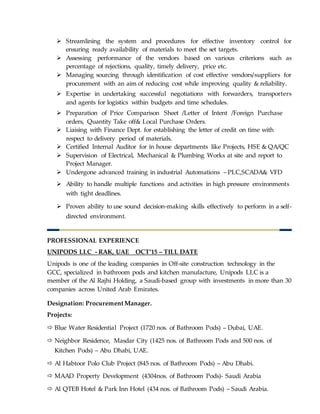 Jaffar John is a procurement manager with over 11 years of experience in procurement for infrastructure construction projects. He has expertise in supply chain management, vendor management, and contract management. His most recent role was as Procurement Manager for Unipods LLC in Dubai, where he handled procurement for residential and hotel bathroom pod projects in the UAE and Saudi Arabia.