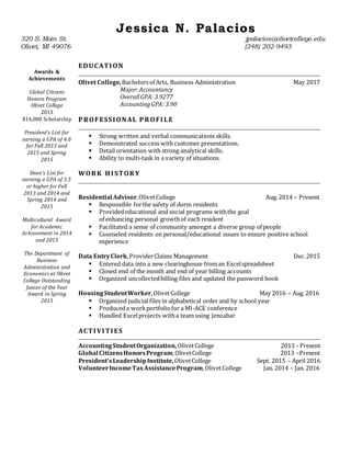 Jessica Palacios is applying for an accountant position at Plastipak Holdings. She is a senior at Olivet College pursuing a Bachelor's degree in Business Administration with an accounting major. Palacios believes her communication skills, attention to detail, and ability to work in various settings would allow her to contribute to the position. She has relevant experience through her coursework, being a residential advisor, and providing tax assistance through VITA. Palacios requests an interview to further discuss the accountant position.