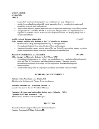 This document is a resume for Karen J. Poor summarizing her 18+ years of experience as an executive assistant providing highly organized administrative support to senior executives. She has extensive experience with tasks like managing calendars, travel, expense reports, meeting coordination, and filing required documents. Her skills include Microsoft Office, various software programs, and she is able to multi-task and take initiative.