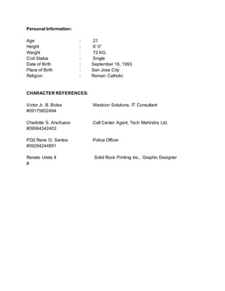 Marc Kevin C. Valdez is a 21-year-old student at STI College Makati studying computer science. He has skills in Microsoft Office, basic programming languages like Visual Basic and Java, and web development technologies. He is looking for an opportunity to utilize and develop his skills in a professional environment. His work experience includes positions at Mivivienda Corp as a sales agent and at Rodzon Marketing Corp in their IT/Accounting department.