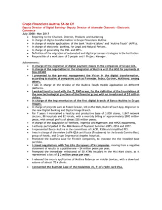 Manuel Domínguez has over 20 years of experience in banking and fintech. He currently works as an Issuer Product and Acquirer Business Director at a fintech company, where he is responsible for prepaid card products, acquiring solutions, and a team of employees. Previously, he held several director roles at large banks, where he helped drive digital transformation initiatives, launch mobile banking applications, and manage credit card and electronic banking programs. He has a strong track record of achieving results, including increasing digital transaction volumes and successfully integrating new payment technologies.