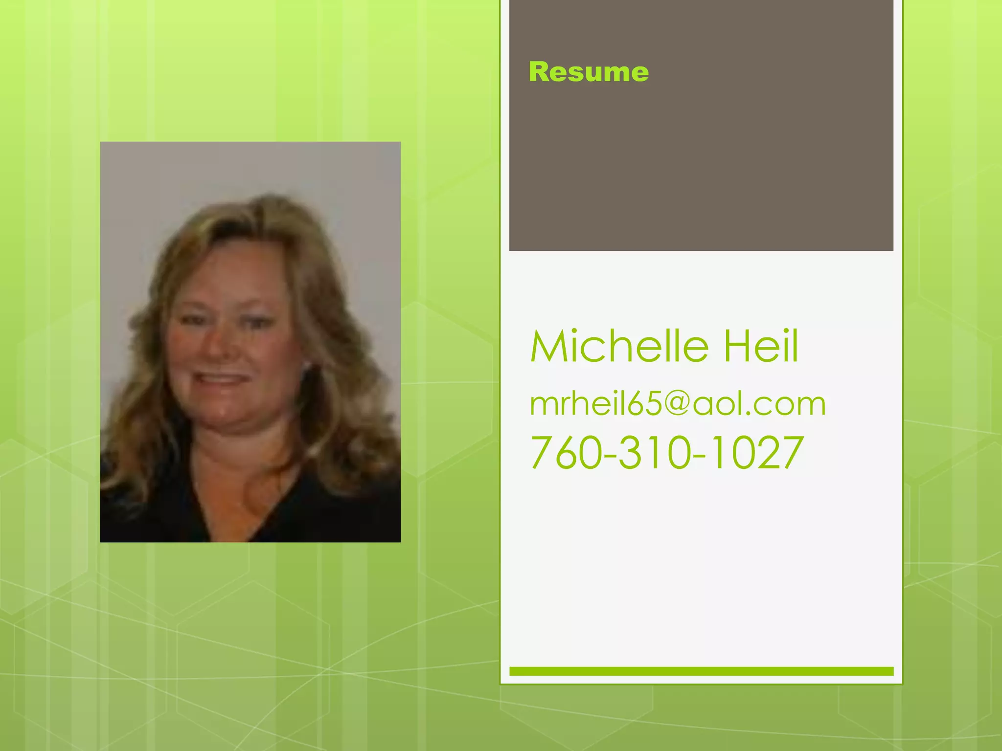 Michelle Heil has over 25 years of experience in education, marketing, and financial services. She holds a Bachelor's degree in Liberal Studies with an education emphasis and minor in Marketing from San Diego State University, a Master's degree in Teaching and Learning with Technology from Ashford University, and a California Multiple Subject Teaching Credential. Her experience includes roles as a teacher, parent volunteer coordinator, college representative, marketing coordinator, operations manager, and current role as an admission counselor for an online university.