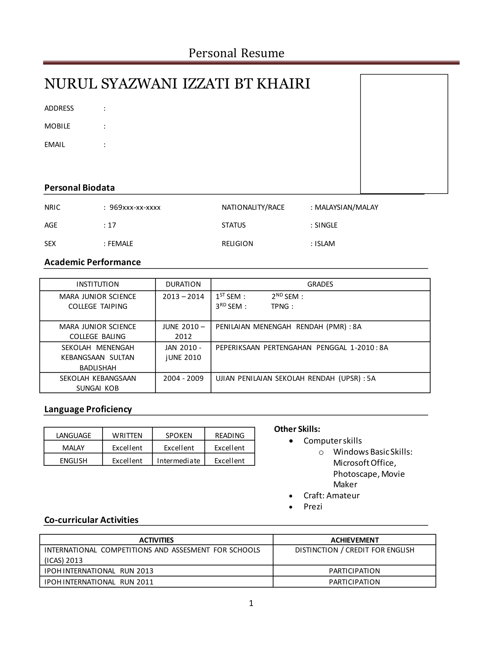 This document is a personal resume for Nurul Syazwani Izzati Bt Khairi. It includes her educational background, language proficiency, extracurricular activities, leadership experience, personality traits, and future career goals. She has attended several schools in Malaysia and achieved strong academic results. Her skills include computer proficiency and crafts. She has participated in running competitions and held leadership roles in various clubs. Her personality is described as creative, curious, confident, and determined. Her goal is to complete an HND in business, then obtain a bachelor's degree from Brunel University before pursuing a marketing career and master's degree.