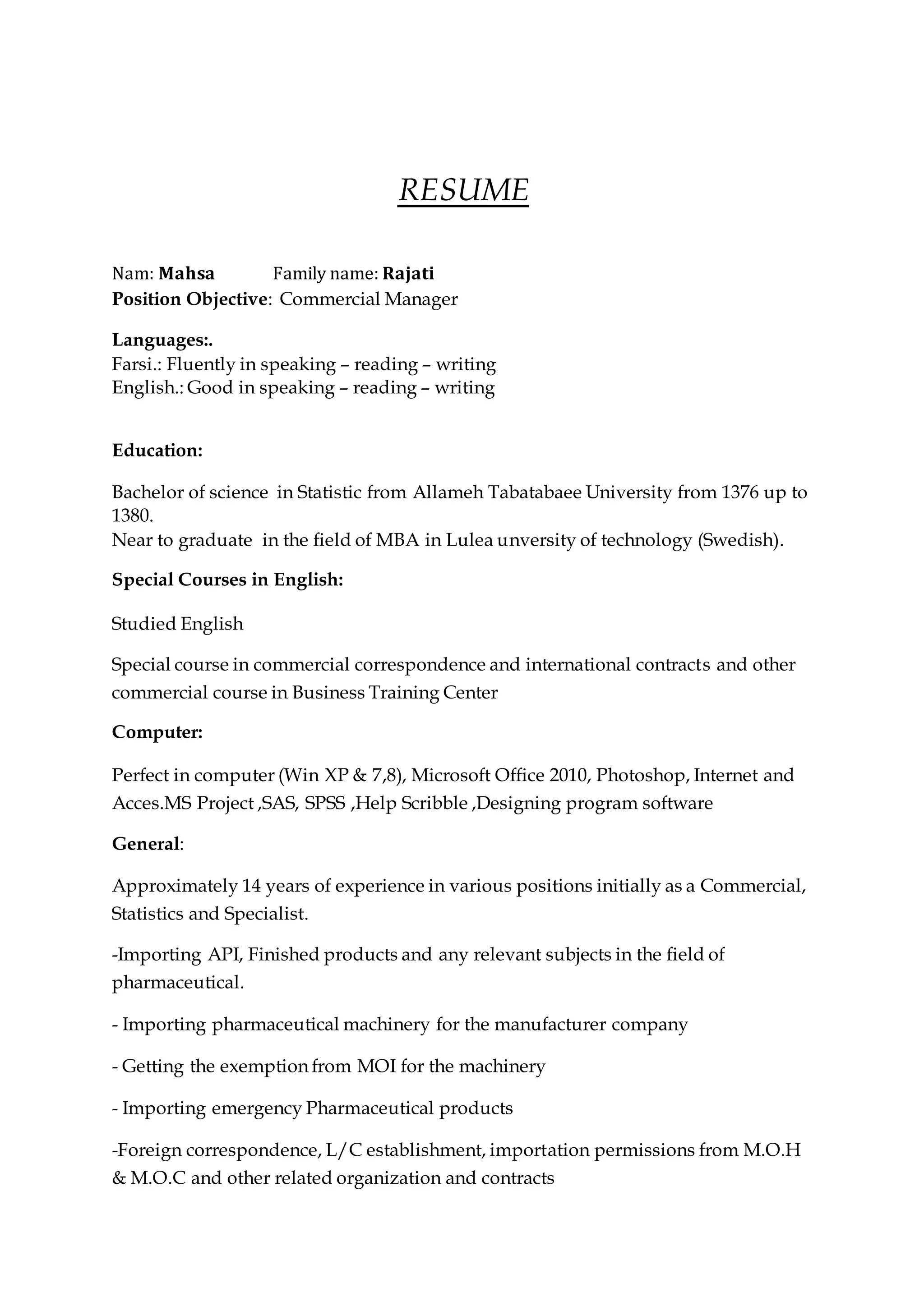 Mahsa Rajati is seeking a position as a Commercial Manager with over 14 years of experience in commercial roles within the pharmaceutical industry. She has a Bachelor's degree in Statistics and is near completion of an MBA. Rajati is fluent in Farsi and proficient in English, and has strong computer skills. Her work history includes commercial roles with several pharmaceutical companies where she managed imports, exports, licensing, budgeting, and more. Currently she is the Commercial Manager at Darou Darmann Pasargad working on importing finished products, APIs, machinery and other relevant pharmaceutical areas.