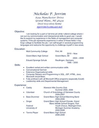 Nicholas Jerrim is seeking a part-time or full-time job to gain experience in management or computer systems while attending college. He has experience in programming languages like SQL, JSP, HTML, Java and Visual Basic. He has worked in retail, as a systems administrator, and as a singer and musician. He is now studying computer science at Mott Community College and hopes to transfer to University of Michigan-Flint.