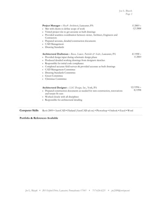 The document is a resume for Joe L. Blazek providing his contact information, career focus, experience, education, and professional experience. It summarizes that Joe has over 20 years of experience in construction administration, project management, and architectural drafting. His most recent role was as an Assistant Project Manager at LSC Design, Inc. where he managed projects, contracts, and provided construction administration duties.