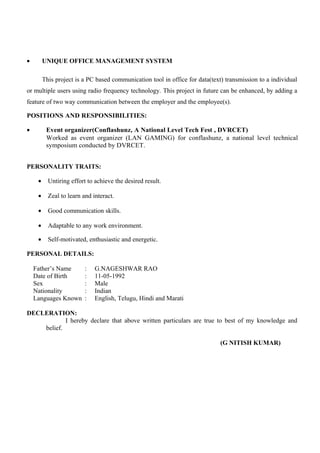 Nitish Kumar is seeking a challenging position where he can utilize his skills and contribute to an organization. He has a Bachelor of Technology degree in Electrical and Communication Engineering from D.V.R. College of Engineering and Technology. His technical skills include programming languages like C and Java as well as Microsoft Office applications. He has experience working on projects like a speed tracking system to detect rash driving and an office management system using radio frequency technology. Nitish also has experience organizing a national level technical symposium as an event organizer.