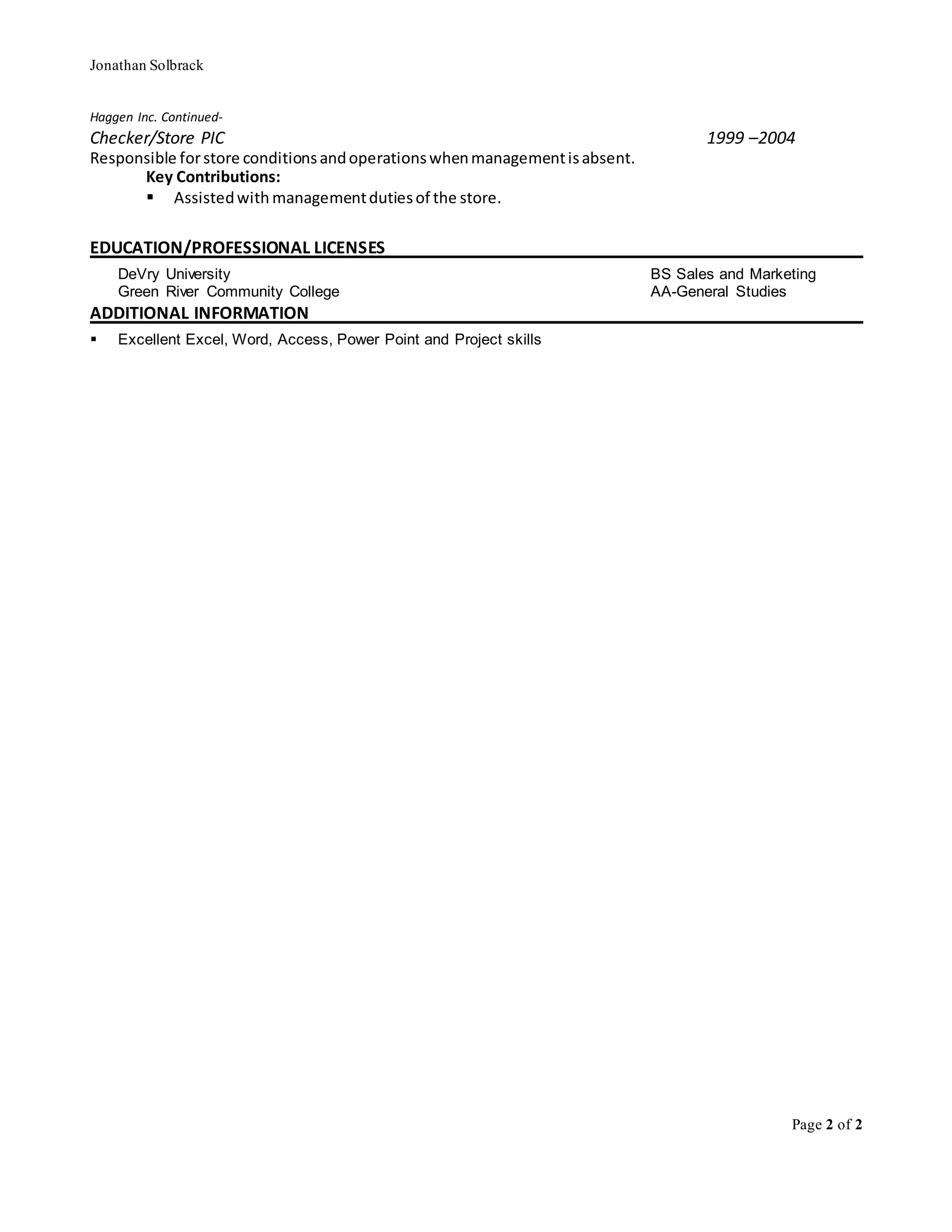 Jonathan Solbrack has over 10 years of experience in retail management, including roles as Assistant Store Director and Store Director for Haggen Inc. He has a proven track record of improving sales, profitability, and operational excellence through strategic planning, budgeting, change management, and developing sales tools and merchandising plans. Solbrack received recognition as Assistant Store Director of the Quarter and Grocery Manager of the Year for his leadership accomplishments.