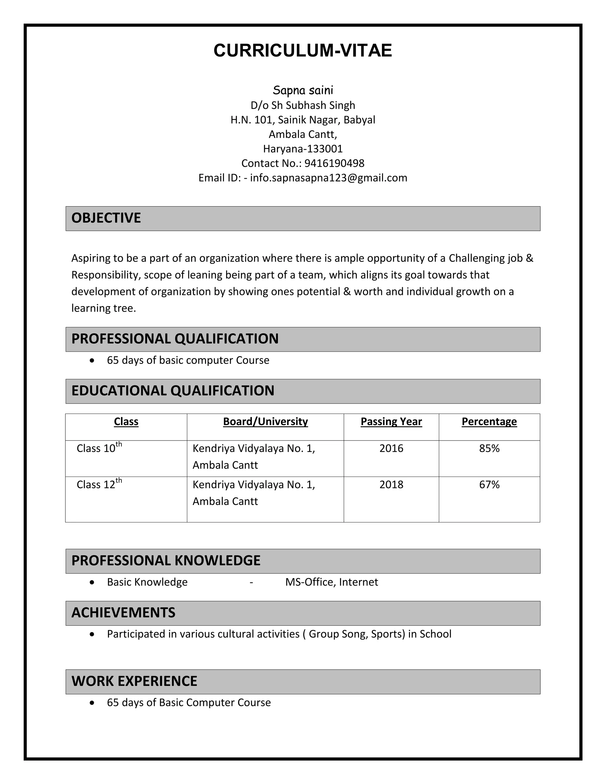 This document is a curriculum vitae for Sapna Saini. It provides her contact information, objective of seeking a challenging job with opportunities for learning and growth. It lists her educational qualifications including completing 10th and 12th grade from Kendriya Vidyalaya No. 1 in Ambala Cantt. It also outlines her 65 days of basic computer training, participation in school activities, strengths like being optimistic and flexible, and personal details.