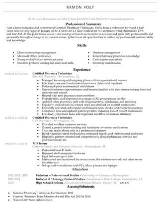 Ramon Holly is an experienced Certified Pharmacy Technician with over 4 years of experience working at CVS and Rite Aid pharmacies who is now seeking new opportunities to advance his career and skills. He has strong skills in customer service, communication, problem-solving and pharmacy procedures. His resume outlines his educational background and accomplishments as well as his work history managing phone calls, prescriptions, inventory and cash register operations at various pharmacy jobs.