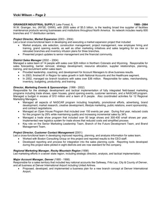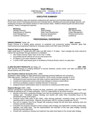 Vicki Wilson is a senior level marketing, sales, and operations professional with over 20 years of experience leading teams and driving revenue growth. She has a proven track record of developing strategies, managing P&L responsibilities, and achieving sales awards and growth at Owens Corning and Clark Security Products. Her experience includes roles in marketing, sales management, operations, and project management.