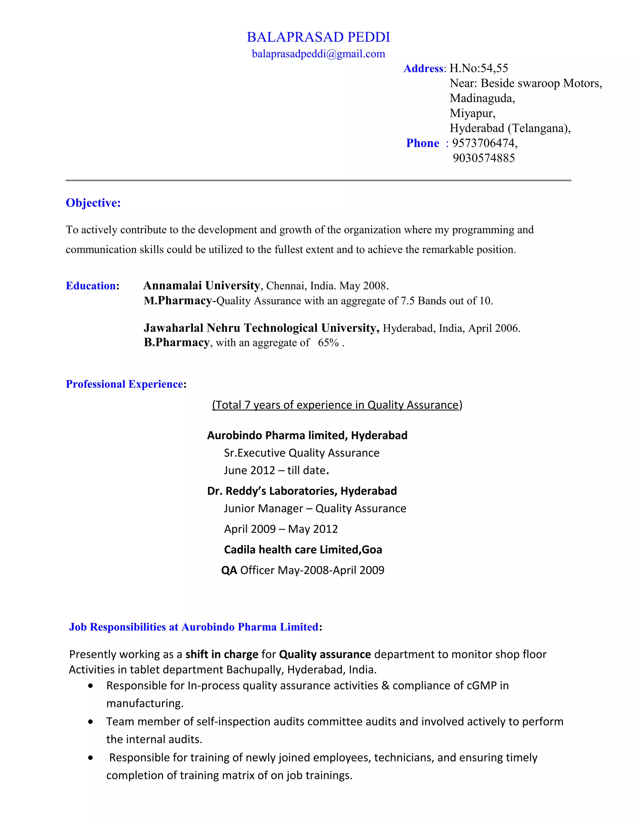 This document contains the resume of Balaprasad Peddi. It summarizes his contact information, objective, education, professional experience working for various pharmaceutical companies over 7 years in quality assurance, job responsibilities in his current and previous roles, an M.Pharm project experience, achievements in successfully passing regulatory audits, and personal details.
