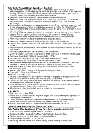 K. Rajesh Kumar is seeking a position that utilizes his 8.8 years of experience in investment banking operations and financial services. He has a Masters in Professional Finance and Banking from Edith Cowan University in Australia and has worked in senior roles at Deutsche Bank and Barclays Bank, managing teams and processes in loan operations, credit operations, and trade execution and closing. He has strong communication, organizational, and problem-solving skills and a proven ability to meet deadlines and work well under pressure.