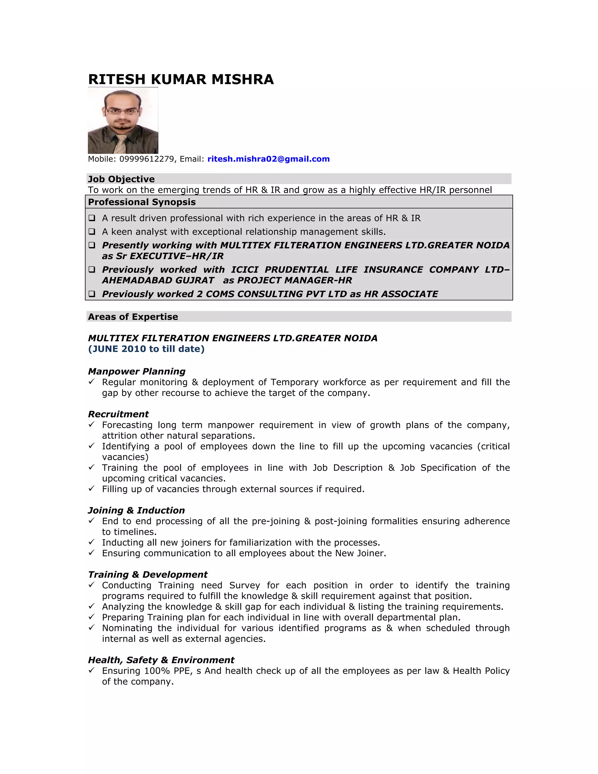 Ritesh Kumar Mishra is a result-driven HR professional with over 10 years of experience in areas like recruitment, training, performance management, and employee engagement. He is currently working as the Senior Executive of HR/IR at Multitex Filteration Engineers Ltd in Greater Noida. Previously, he has worked as the Project Manager of HR at ICICI Prudential Life Insurance Company and as an HR Associate at 2Coms Consultanting Pvt Ltd. He holds an MBA in Human Resources and has expertise in areas such as manpower planning, recruitment, training, health and safety, and union handling.