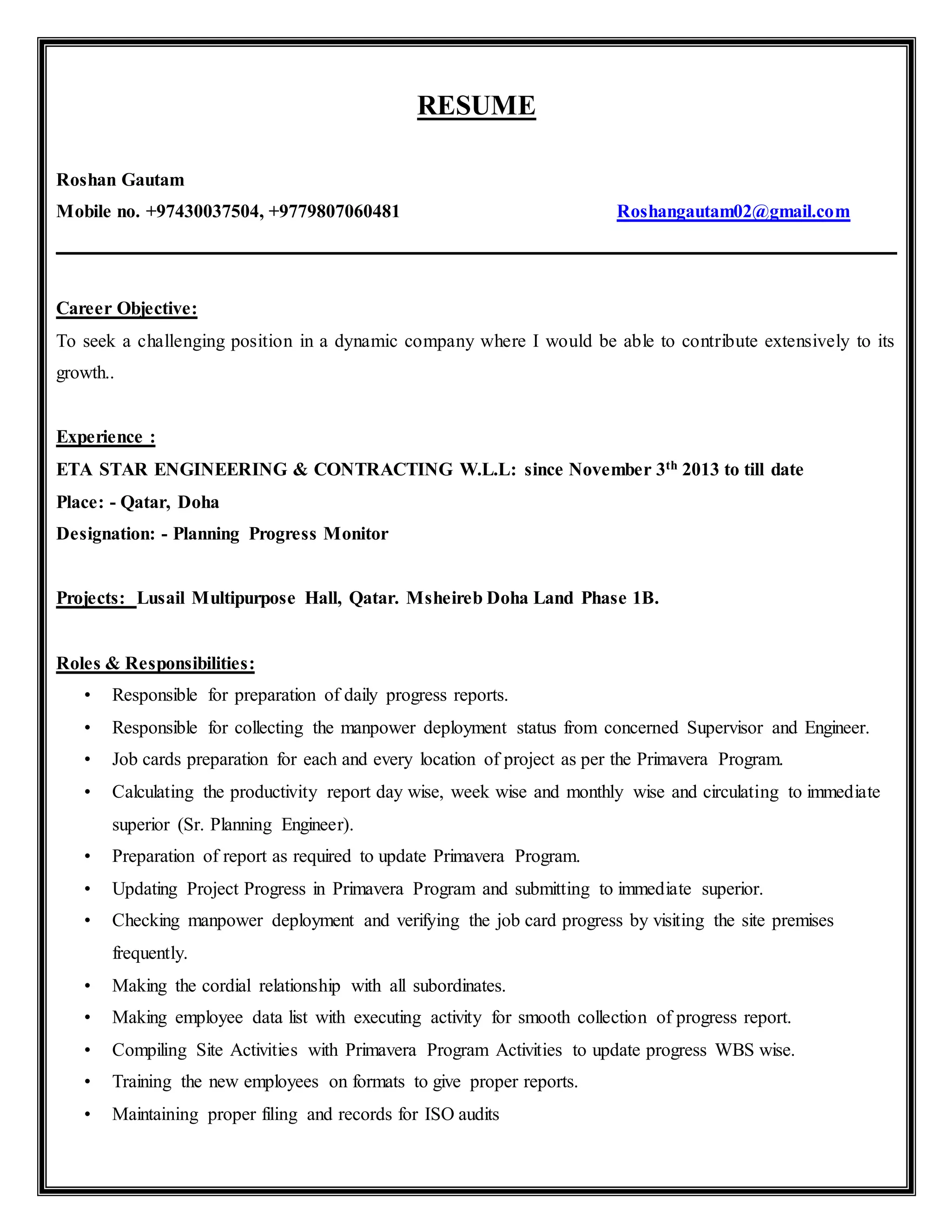 Roshan Gautam is seeking a challenging position in a dynamic company where he can contribute to its growth. He has worked as a Planning Progress Monitor for ETA STAR ENGINEERING & CONTRACTING W.L.L. in Qatar since 2013, monitoring projects such as the Lusail Multipurpose Hall. His responsibilities include preparing daily progress reports, collecting workforce status, updating schedules, and maintaining records. He has skills in MS Office, Primavera, databases, problem-solving, and teamwork.