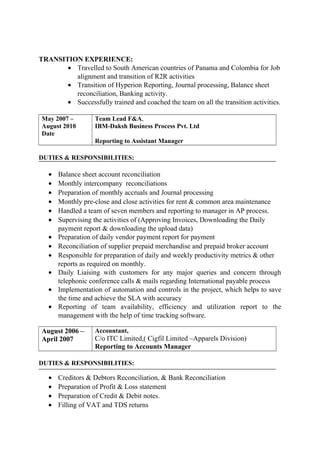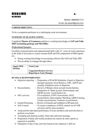 S. Rubesh has over 12 years of experience in accounting roles. He is proficient in SAP and Tally ERP accounting software. Currently he is a team lead at Capgemini Business Services where he manages tasks like Hyperion reporting, balance sheet reconciliations, journal processing, and ensuring SOX compliance. Previously he has worked as a team lead for IBM-Daksh Business Process and in accounting roles for other companies. He has a Master's degree in Commerce.