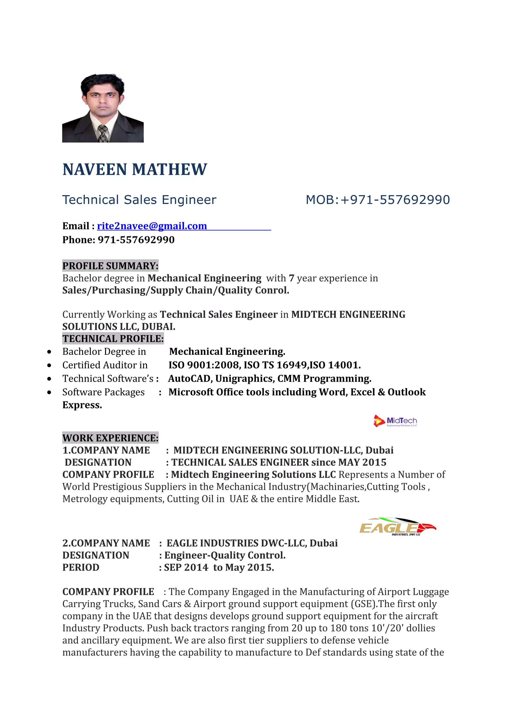 Naveen Mathew is a Technical Sales Engineer with 7 years of experience in sales, purchasing, supply chain, and quality control. He holds a Bachelor's degree in Mechanical Engineering and certifications in ISO 9001, ISO TS 16949, and ISO 14001. Currently he works as a Technical Sales Engineer for Midtech Engineering Solutions LLC in Dubai, where he previously worked in quality control roles for two other engineering companies. He has extensive experience in quality management, auditing, inspection, and calibration.