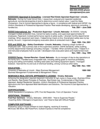 The document is a resume for Steve R. Jensen, who is seeking a challenging Production Supervisor position managing people and multiple production lines. He has 20 years of experience supervising production operations and safety protocols in manufacturing facilities. His management style focuses on lean principles and continuous improvement to keep employees happy while producing high-quality, low-cost products with short delivery times. He also has experience in real estate appraisal.