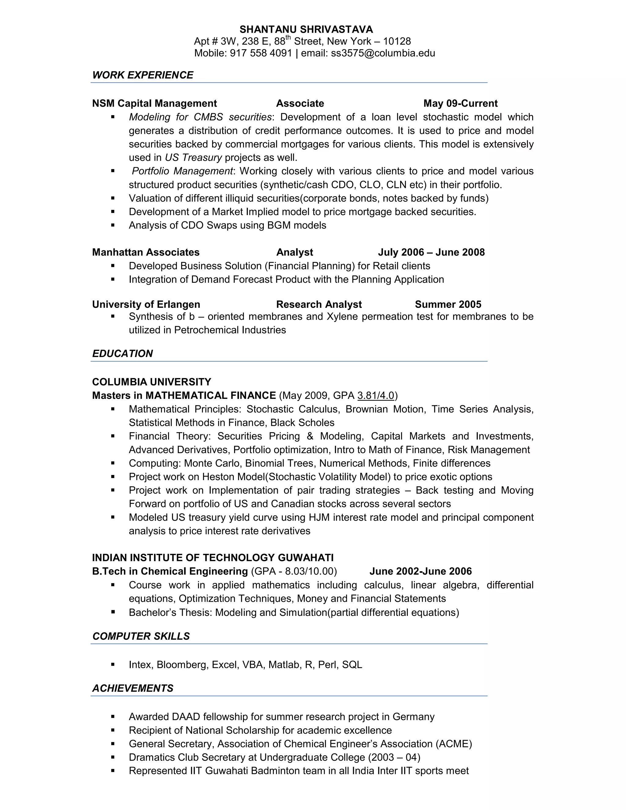 This document contains a resume for Shantanu Shrivastava. It summarizes his work experience in financial modeling and analysis at NSM Capital Management and Manhattan Associates. It also lists his education including a Master's degree in Mathematical Finance from Columbia University and a Bachelor's degree in Chemical Engineering from Indian Institute of Technology Guwahati. His skills include financial modeling, quantitative analysis, and programming languages.