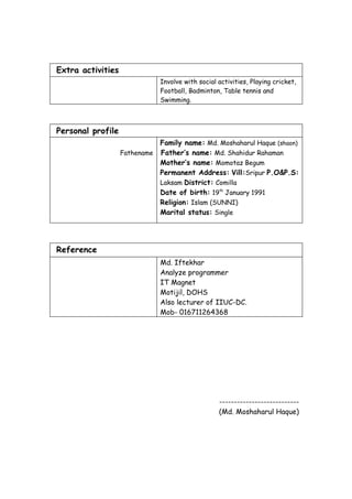 Md. Moshaharul Haque is seeking a job where he can be creative, hard working, sincere, honest, timely and devoted to his duties. He has completed 3 semesters of a BBA at the International Islamic University Chittagong-Dhaka campus with a GPA of 3.50 for the 1st semester and 3.60 for the 2nd semester. He has proficiency in Bangla, English, computers, Windows, MS Office and can operate Internet browsers. He enjoys social activities like playing cricket, football and swimming.