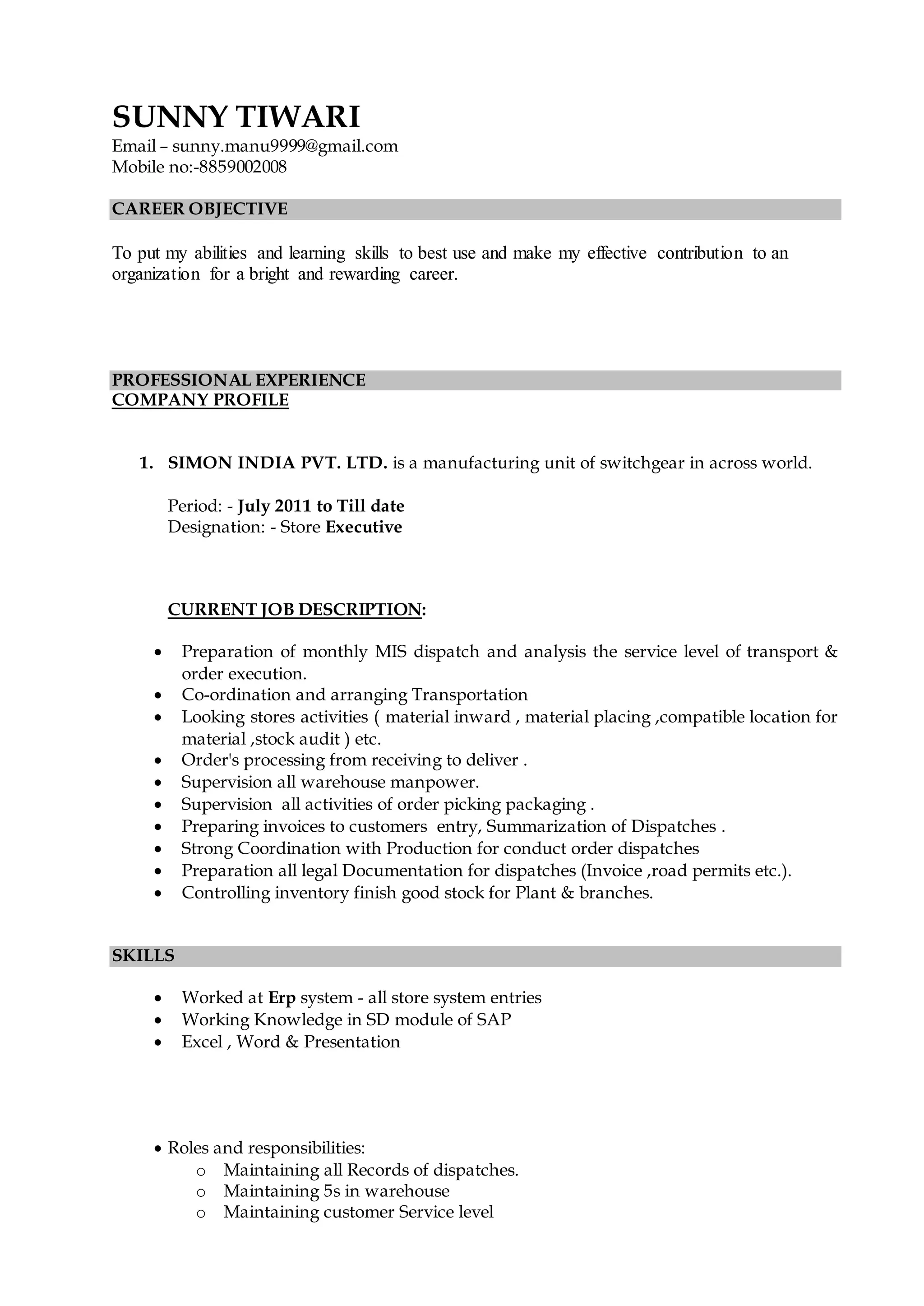Sunny Tiwari is seeking a position that allows him to effectively contribute to an organization for a rewarding career. He has over 7 years of experience as a Store Executive at Simon India Pvt. Ltd., a manufacturing company of switchgear. In this role, he is responsible for tasks like transportation coordination, inventory management, order processing, and maintaining customer service levels. He has skills in ERP systems, SAP, Excel, Word, and presentations. He holds a B.Com degree and was awarded Rising Star of the Year at Simon Electric India Pvt. Ltd in 2015.