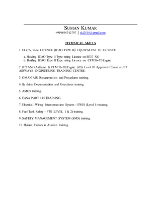 Suman Kumar has over 10 years of experience as an aircraft maintenance engineer and certifying engineer at Jet Airways in India. He holds certifications for Boeing 737-NG aircraft and CFM56-7B engines. His responsibilities have included transit inspections, layovers, component replacements, and troubleshooting. He assisted with engine removals and installations for various aircraft. Kumar received his aircraft maintenance engineering degree from the Indian Institute of Aeronautics and holds technical skills including EASA and OEM training.