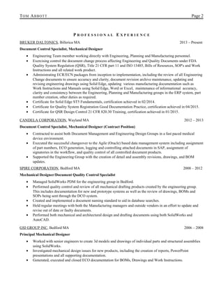 Tom Abbott is a mechanical engineering designer with over 15 years of experience in 3D modeling for the life sciences and semiconductor industries, alongside expertise in documentation and quality control compliance. He has worked with multiple data management and design software such as SolidWorks and SAP, and has held various positions focusing on document control and mechanical design in multiple organizations. Abbott has a strong educational background and holds several certifications related to quality systems and engineering processes.