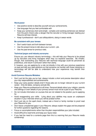 The document provides tips for creating an effective resume. It advises that recruiters spend only 30 seconds screening each resume, so the content and layout must convey who you are and what you can offer in that short time. It also recommends tailoring your resume to the specific role by researching the requirements and highlighting how your skills and experiences match them. Finally, it offers formatting tips like keeping the resume to 3 pages or less and using positive language to describe your qualifications and achievements.