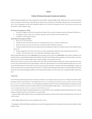 Dokumen tersebut membahas tentang penganggaran modal yang meliputi pengertian, proses, jenis investasi, dan metode evaluasi kelayakan rencana investasi. Beberapa metode evaluasi yang disebutkan antara lain payback period, average rate of return, net present value, dan internal rate of return.