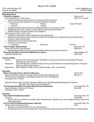 Shawn M. Smith has over 10 years of experience in logistics, operations, and inventory management. He currently works as a General Warehouse Team Coach at JCPenney Logistics in Atlanta, GA where he has led teams of up to 200 members and implemented process improvements. Previously, he held roles at Price Chopper Supermarkets and Penn State University. Smith has a Bachelor of Science in Supply Chain and Operations Management from Miami University and a Bachelor of Science in Finance from Penn State. He is proficient in various applications and has been recognized for his leadership and process improvement initiatives.