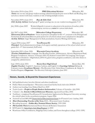 This document is a resume for Shannen L. Webb, an English and alternative education teacher with 14 years of experience teaching grades K-12. She has a Bachelor's degree in Secondary Education English and a Master's degree in Curriculum and Instruction. Her experience includes teaching English, creative writing, and other courses at Milwaukee Public Schools. She also has experience tutoring, mentoring at-risk students, and teaching summer courses through University of Wisconsin-Milwaukee. The resume lists her education, certifications, teaching experience, honors and awards, and professional references.