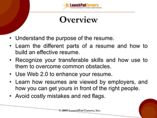 This document provides an overview of resume writing. It discusses the purpose and components of a resume, including the header, summary, experience section, and other optional categories. It also covers different resume formats (chronological, functional, technical) and when each is most effective. Tips are provided for tailoring resumes to specific jobs and industries using keywords from job descriptions. The document emphasizes highlighting accomplishments, skills, and how the applicant's experience will benefit potential employers.
