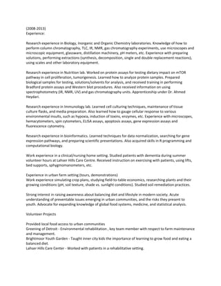 John Whittaker is a student at Wayne State University studying Nutrition and Food Science with expected graduation in 2014. He has experience in biological and chemical research labs covering areas like directed study, lab research, and increasing responsibilities. His coursework includes subjects like human metabolism, organic chemistry, and physics. He has research experience in labs studying the mTOR pathway regulation related to diet and trauma response in obese patients. John is proficient in Microsoft Office, budget planning, and various math disciplines. He has internship experience in immunology and Alzheimer's disease research and has tutored high school students.