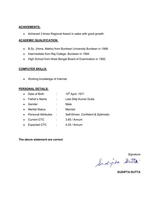 Sudipta Dutta is seeking a marketing and sales position. He has over 16 years of experience as a professional service representative for Win Medicare Pvt. Ltd., where he was responsible for sales monitoring, new product development, implementing company strategies, and relationship management. He holds a B.Sc. in Mathematics and has received three regional awards for sales growth.