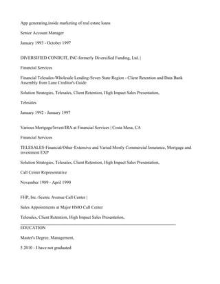 Ian Banwell has over 20 years of experience in financial services telemarketing and sales. He has held roles such as Telesales Specialist, Retirement Assistant, Inside Sales, and Senior Account Manager. Banwell has a background in client retention, sales presentations, and generating financial and real estate loans through telephone outreach. He is pursuing a Master's degree in Management and holds a Bachelor's degree in Liberal Arts.