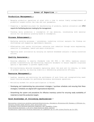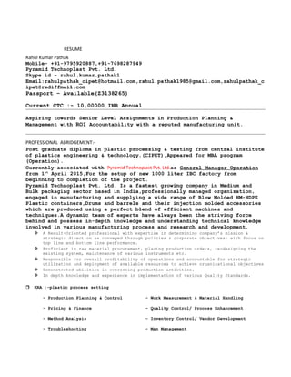 Rahul Kumar Pathak is a General Manager of Operations with over 10 years of experience in plastic production planning and management. He is currently managing operations at Pyramid Technoplast Pvt. Ltd., including setting up a new IBC factory. Pathak has expertise in production management, process enhancement, quality assurance, and resource management. He holds a post-graduate diploma in plastic processing and testing and pursued an MBA.