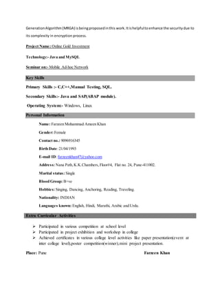 Farzeen Khan seeks a challenging job utilizing her skills in IT, including C, C++, SQL, Java, and SAP. She has a B.E. in IT with 62% marks and certifications in MS-CIT and SAP Netweaver. Her academic projects include using color/images for one-time session passwords and an algorithm to enhance security for public key systems. She has experience in manual testing and likes singing, dancing, and traveling.