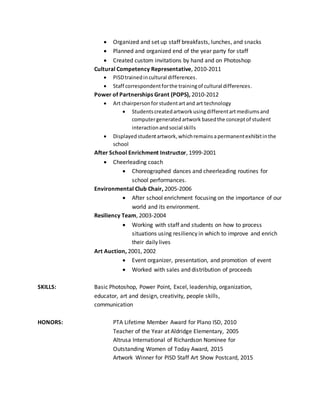 The document provides a summary of Abigail Anderson's experience and qualifications. It outlines her education at the University of North Texas where she received a BFA in Art Education and K-12 certification. She has 19 years of experience as an Art Specialist for the Plano Independent School District. She also has experience teaching art, theater, and creative writing for summer programs and private art instruction. The document lists her various roles and responsibilities in organizations, committees, and charitable activities related to her work as an educator and artist.