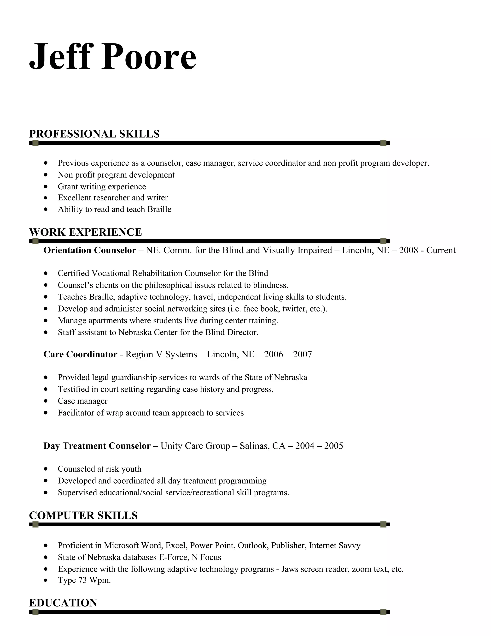 Jeff Poore has experience as a counselor, case manager, and program developer for non-profits. He currently works as an Orientation Counselor for the Nebraska Commission for the Blind and Visually Impaired, where he counsels clients, teaches skills like Braille, and manages student housing. Previously he was a Care Coordinator providing guardianship services and a Day Treatment Counselor developing programming for at-risk youth. He has skills in grant writing, research, writing, and reading Braille, as well as proficiency in Microsoft Office and state databases.