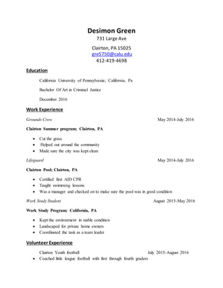 This document is a resume for Desimon Green that outlines his education and work experience. He received a Bachelor of Arts in Criminal Justice from California University of Pennsylvania in December 2016. His work experience includes positions on the grounds crew and as a lifeguard for the Clairton Summer program and Pool from 2014 to 2016. He also worked as a work study student from 2015 to 2016 at California University, where he did landscaping and coordinated tasks. His volunteer experience involved coaching youth football and basketball in Clairton from 2015 to 2016.