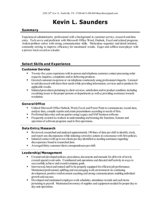 Kevin Saunders has over 25 years of experience in customer service, data entry, research, and administrative roles. He is proficient in Microsoft Office programs and has strong communication, problem solving, and organizational skills. Saunders has a background in leadership, having created policies and procedures and directed staff activity to successfully achieve company goals.